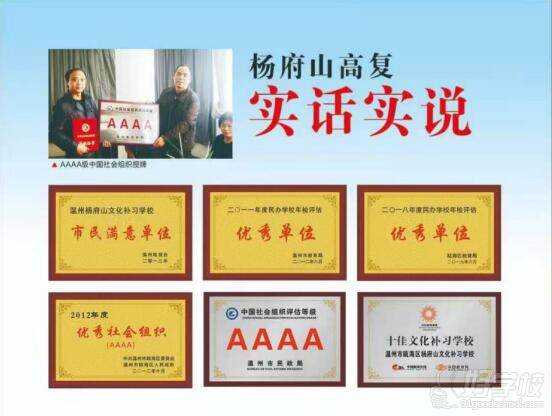 先后获得全国十佳高考复习机构、瓯海区办学评估优秀学校、AAAA级中国社会组织 (温州市民收局) 、温州市教育局办学评估优秀单位、优秀AAAA社会组织 (中共瓯海区委、瓯海区人民政府)等众多名誉。